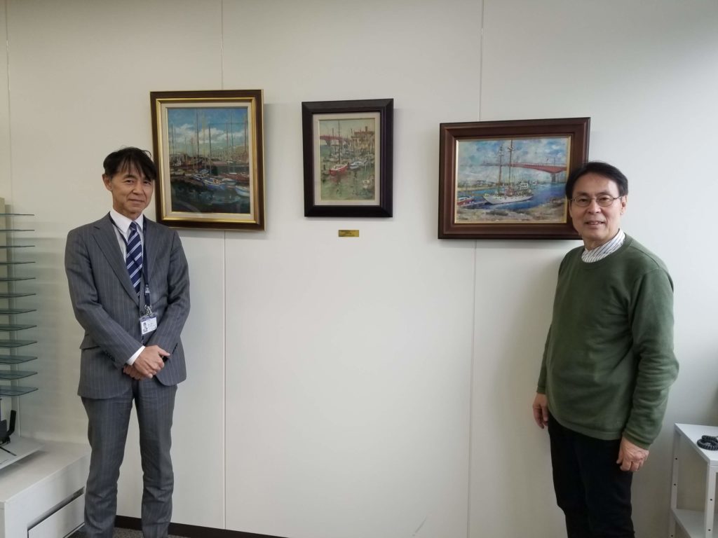 定年退職まで長くない今、この絵たちが故郷の空気を吸って生きていけるように、しかも、良い船出を準備するハーバー精神でもって 大学院生の皆さんが法曹界に打って出られますように、という願いを込めて寄贈した。案内してくださった司法研究科事務長の植田幸利さんがぼくの経済学部赴任時の学部事務長でいらっしゃたことも、感慨深い。